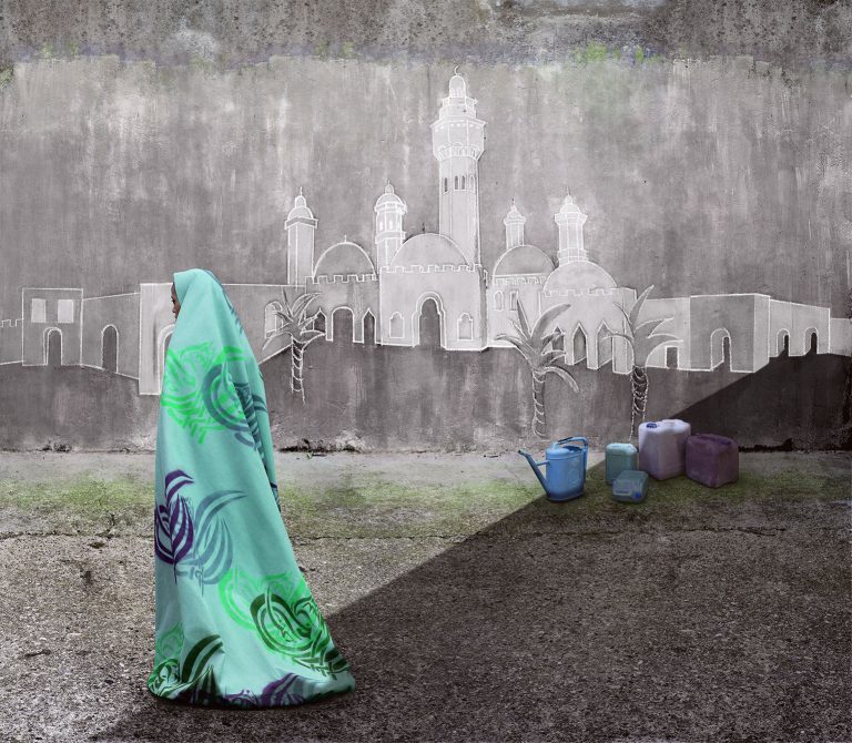 Her Private Garden and Aisha’s Stories 2 are part of the Aisha in Wonderland project in which the artist studies various aspects of a new possible identity, proposing them through different media. In this context, the subjects that Maïmouna Guerresi chooses to portray belong to the second generation of a Moroccan and Senegalese family who emigrated to the Veneto. This visual narration no longer sees Aisha as the main subject, rather it is the gaze through which the observer accesses a hidden inner universe. The visual articulation of the dual cultural belonging of the subjects takes shape through the alternation of drawn exotic landscapes and images of the green valleys of Veneto.