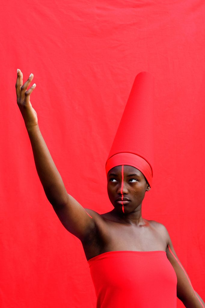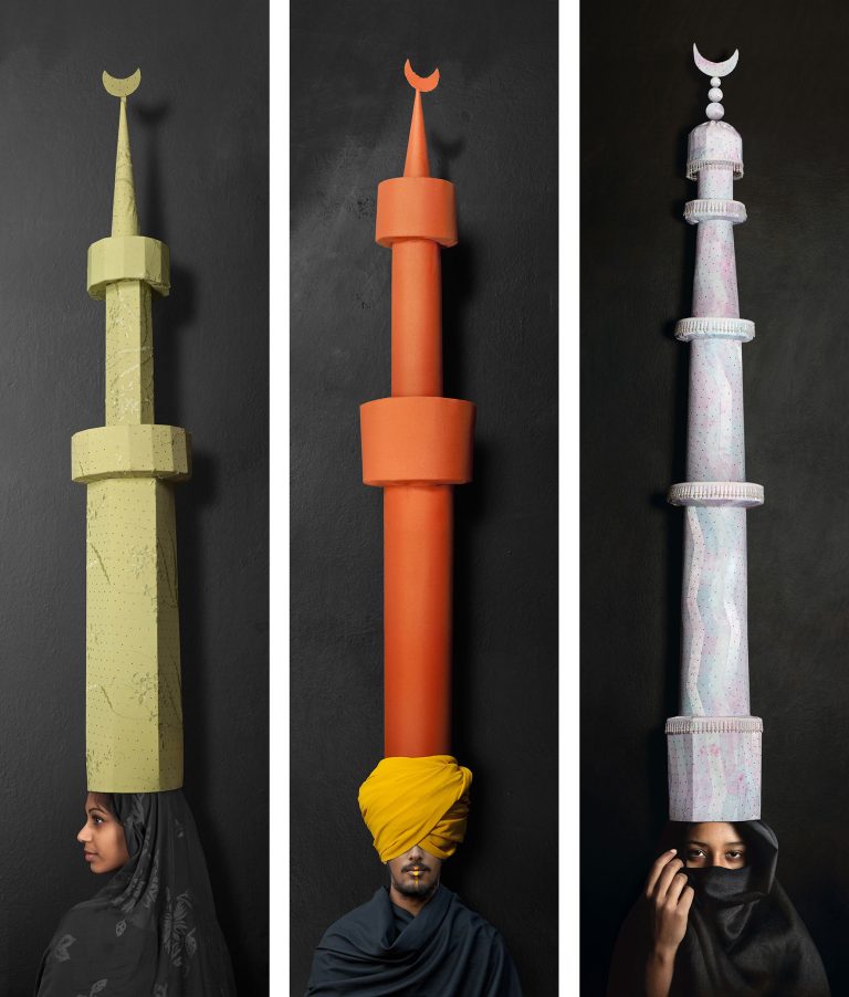 Minaret Hats represent the continuation of the research on the mystical body that the artist represents as a metaphysical and supernatural body. The “minaret hats” are like castles, fortresses placed to protect the head, the highest part of the human body. But they are also an extension of the same body: receptive antennae, channels that lead and impart spiritual energy, as in the traditions of the ancient Mali Dogon people in West Africa. Maïmouna Guerresi herself creates these artifacts that she makes the female and male characters and photographs theme. Their faces are hidden by a movement of the hand, sometimes they are covered or simply close their eyes, they seem to withdraw from the world to get in harmony with the divine cosmic spirit.