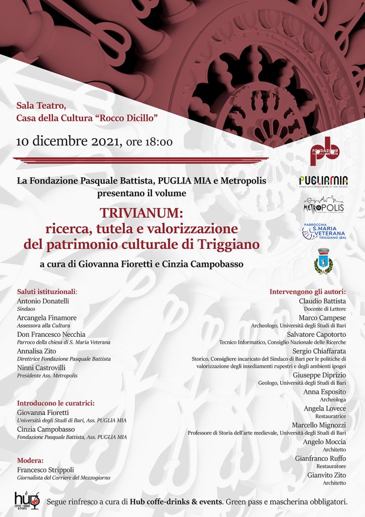 Il 10 dicembre alle 18.00 nella Sala Teatro della Casa della Cultura “Rocco Dicillo” di Triggiano, la Fondazione Pasquale Battista, l’associazione culturale PUGLIA MIA e l’associazione di promozione sociale Metropolis, con il patrocinio del Comune di Triggiano, presentano il volume TRIVIANUM – Ricerca, tutela e valorizzazione del patrimonio culturale di Triggiano.